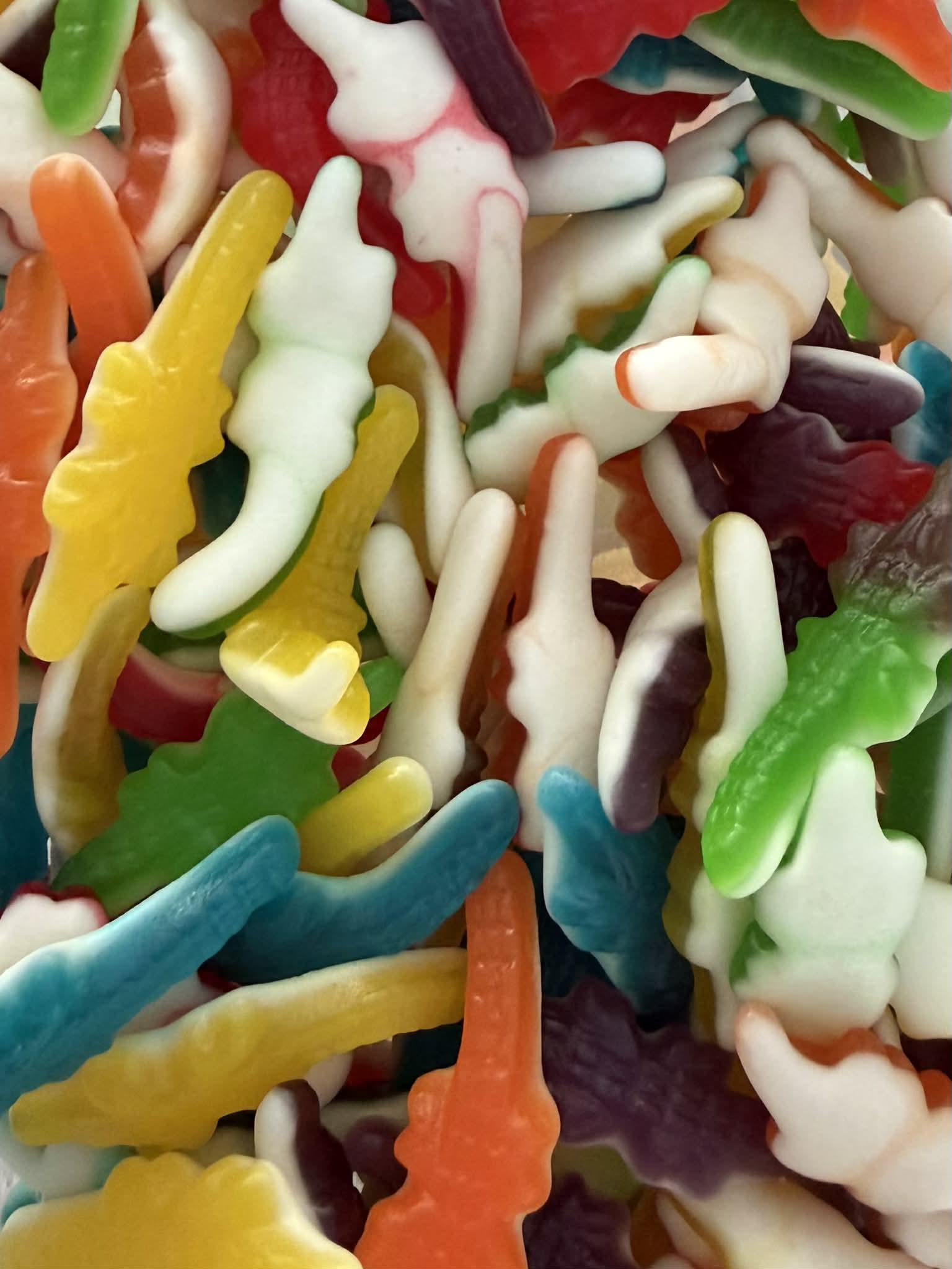 ingrédients : Sirop de glucose, sucre, eau, gélatine de boeuf, amidon modifié de pomme de terre, acidifiants : E270, E330, agent d'enrobage : huile végétale (palme et coco) E901, E903, pectine, arômes, colorants : E129, E100, E133. Sans Gluten.