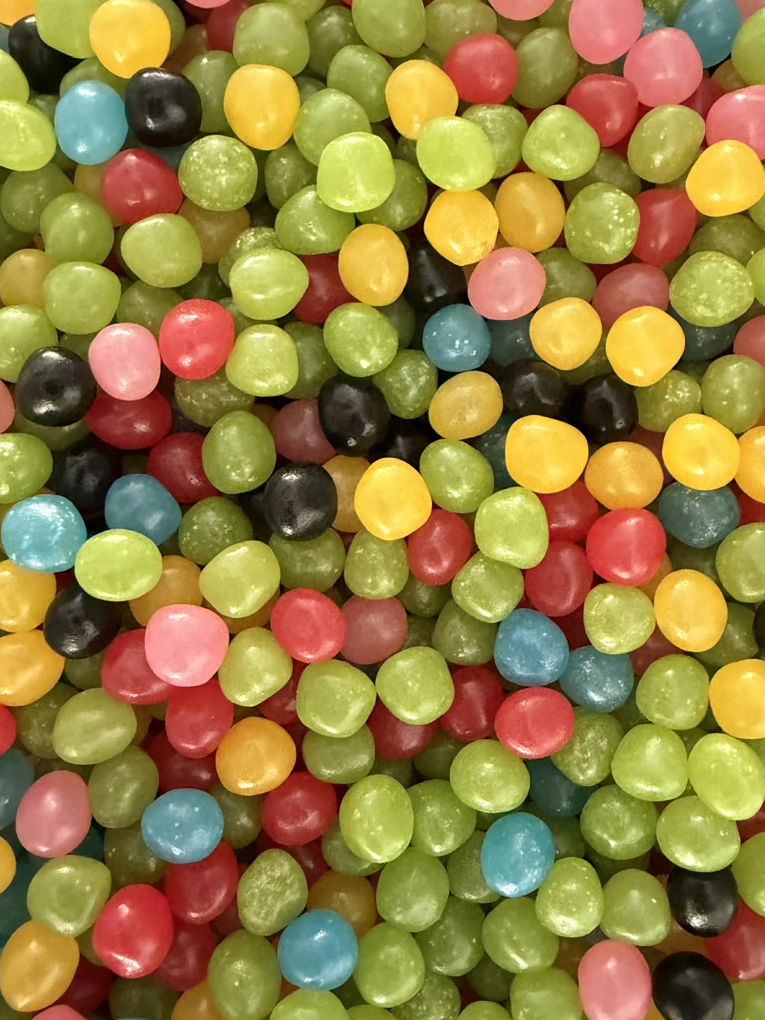 ingrédients : Sucre, sirop de glucose, amidon, acidifiant : acide citrique, acide malique, correcteurs d'acidité : citrate monosodique, malate acide de sodium, huile de tournesol, concentré de spiruline, arômes, colorants : curcumine, charbons végétal, anthocyanes, agents d'enrobage : cire d'abeille.